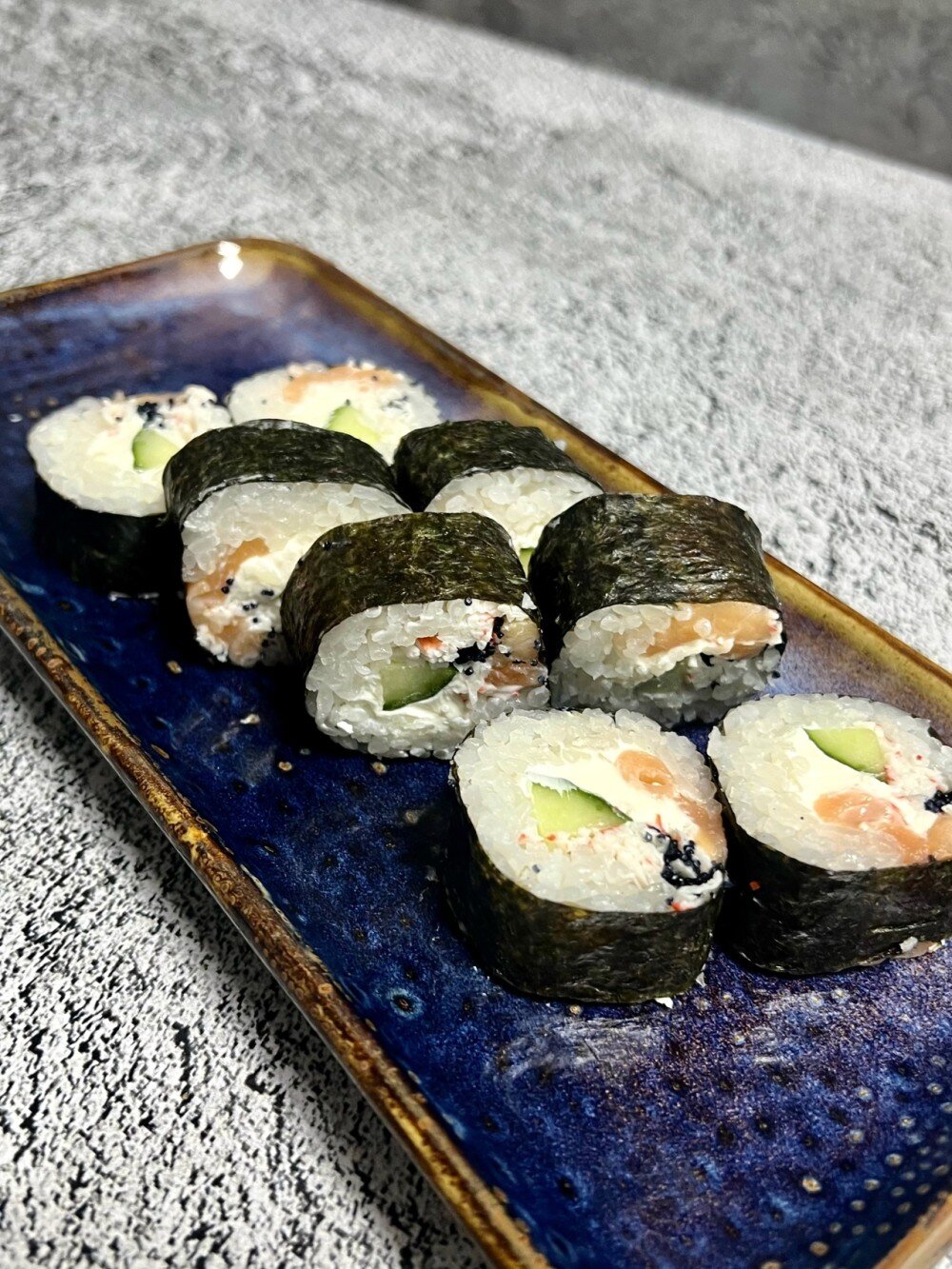 нори, рис, лосось, снежный краб (имитация крабовой палочки), сливочный сыр, икра масаго и огурец