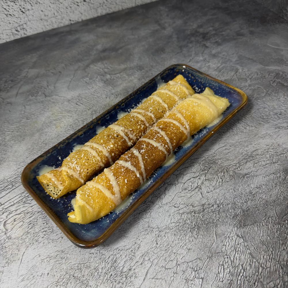Сладкие блинчики, с творожной начинкой, кокосовым топингом и кокосовой стружкой