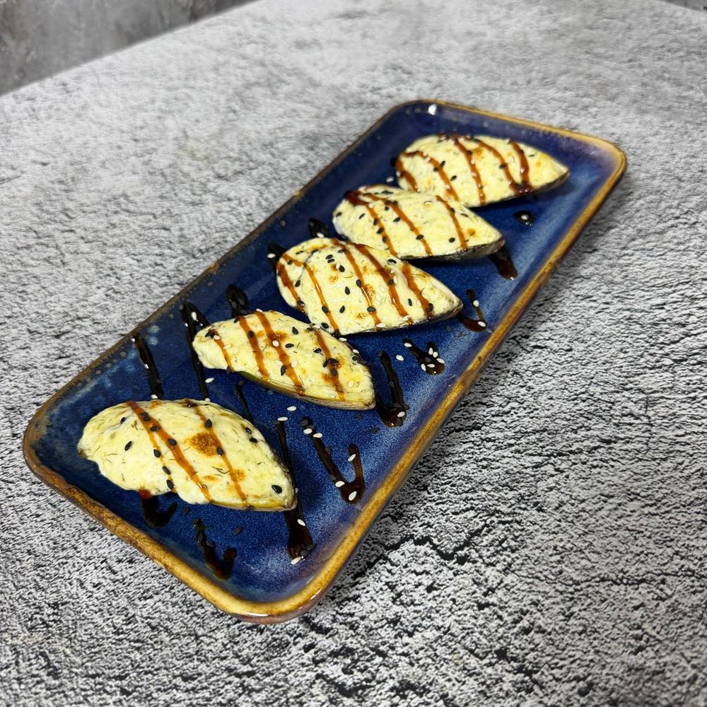 Запеченные мидии с рисом, лососем под сливочной шапочкой, с соусом терияки